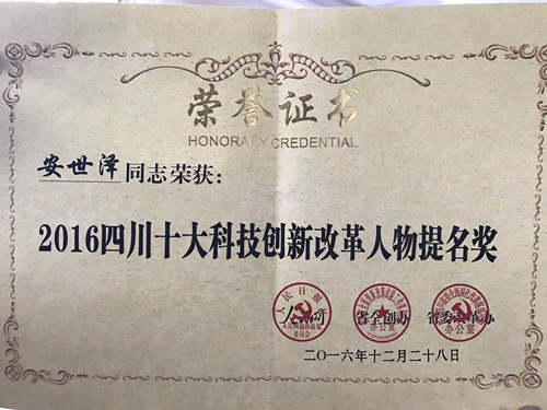院長(zhǎng)安世澤獲 “2016四川十大科技創(chuàng)新改革人物”提名獎(jiǎng)