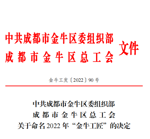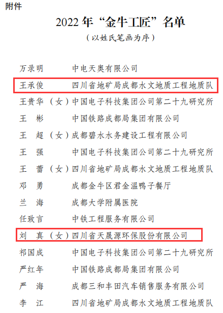 2022122日,中共成都市金牛區(qū)委組織部成都市金牛區(qū)總工會發(fā)布《關于命名2022年“金牛工匠”的決定》,四川省天晟源環(huán)保股份有限公司(簡稱“天晟源環(huán)保”)王承俊、劉真、童賢清三人獲得“金牛工匠”認定。至此,天晟源環(huán)保已有5人獲得“金牛工匠”稱號認定。