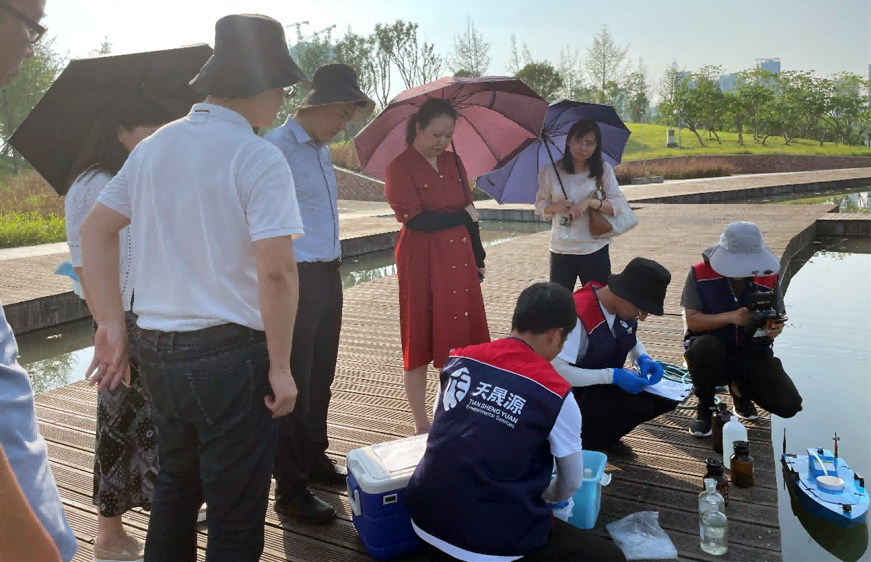 會后,蔡曉芳副總裁一行來到天晟源環(huán)保駐天府新區(qū)成都直管區(qū)項目組參觀湖庫水質(zhì)監(jiān)測工作,項目組負(fù)責(zé)人蔣定邦介紹了天晟源環(huán)保作為天府新區(qū)掛牌的環(huán)境監(jiān)測站的主要工作內(nèi)容和自主研發(fā)的初代無人采樣船的制作工藝及引申功能。在興隆湖環(huán)境空氣采樣、道路交通噪聲監(jiān)測、酸沉降(大氣降水)項目現(xiàn)場,蔡曉芳副總裁聽取了監(jiān)測人員對監(jiān)測設(shè)備和道路交通噪聲監(jiān)測點位布設(shè)原則的介紹。她表示,項目組研發(fā)使用的無人船能夠有效提升工作效率、保障人員安全,這樣的創(chuàng)新精神值得鼓勵和推廣。調(diào)研中,蔡曉芳副總裁等領(lǐng)導(dǎo)多次贊揚天晟源環(huán)保工作人員在夏季高溫環(huán)境中不怕苦、能吃苦的工作態(tài)度,展現(xiàn)了天晟源環(huán)保人昂揚的精神態(tài)度。