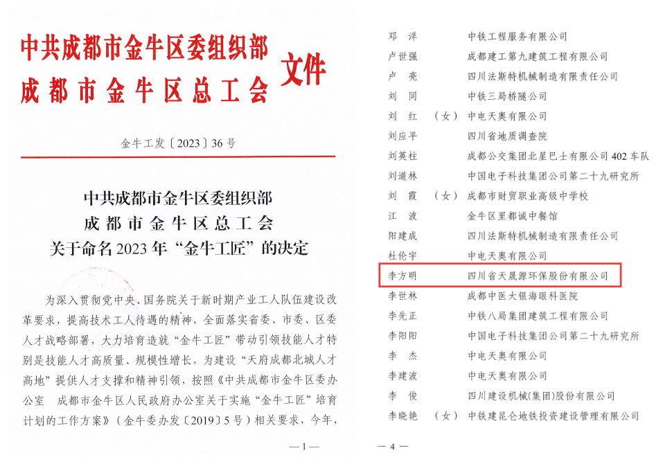 近日,中共成都市金牛區(qū)委組織部成都市金牛區(qū)總工會發(fā)布《關(guān)于命名2023年“金牛工匠”的決定》(金牛工發(fā)〔2023 ] 36號),四川省天晟源環(huán)保股份有限公司(簡稱“天晟源環(huán)?!保├罘矫鳂s獲“金牛工匠”榮譽稱號。