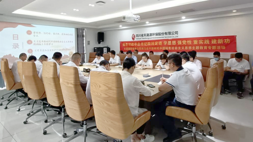 參觀學(xué)習(xí)后,天晟源環(huán)保黨支部在公司第一會議室召開學(xué)習(xí)貫徹習(xí)近平新時代中國特色社會主義思想主題教育專題學(xué)習(xí)會。在會上,新一屆支部委員會向黨員、干部講解了本次主題教育的由來,強調(diào)了這次學(xué)習(xí)的重要性和緊迫性。同時,還宣讀了上級黨委的文件,明確了學(xué)習(xí)的目標(biāo)和要求。為了確保學(xué)習(xí)的效果,支部委員會組織支部黨員重點學(xué)習(xí)了“學(xué)思想、強黨性、重實踐、建新功”的內(nèi)在含義,專題研讀了《習(xí)近平新時代中國特色社會主義思想專題摘編》。在專題學(xué)習(xí)會上大家一致認(rèn)為,習(xí)近平生態(tài)文明思想是習(xí)近平新時代中國特色社會主義思想的重要組成部分,是生態(tài)文明建設(shè)的指南針。