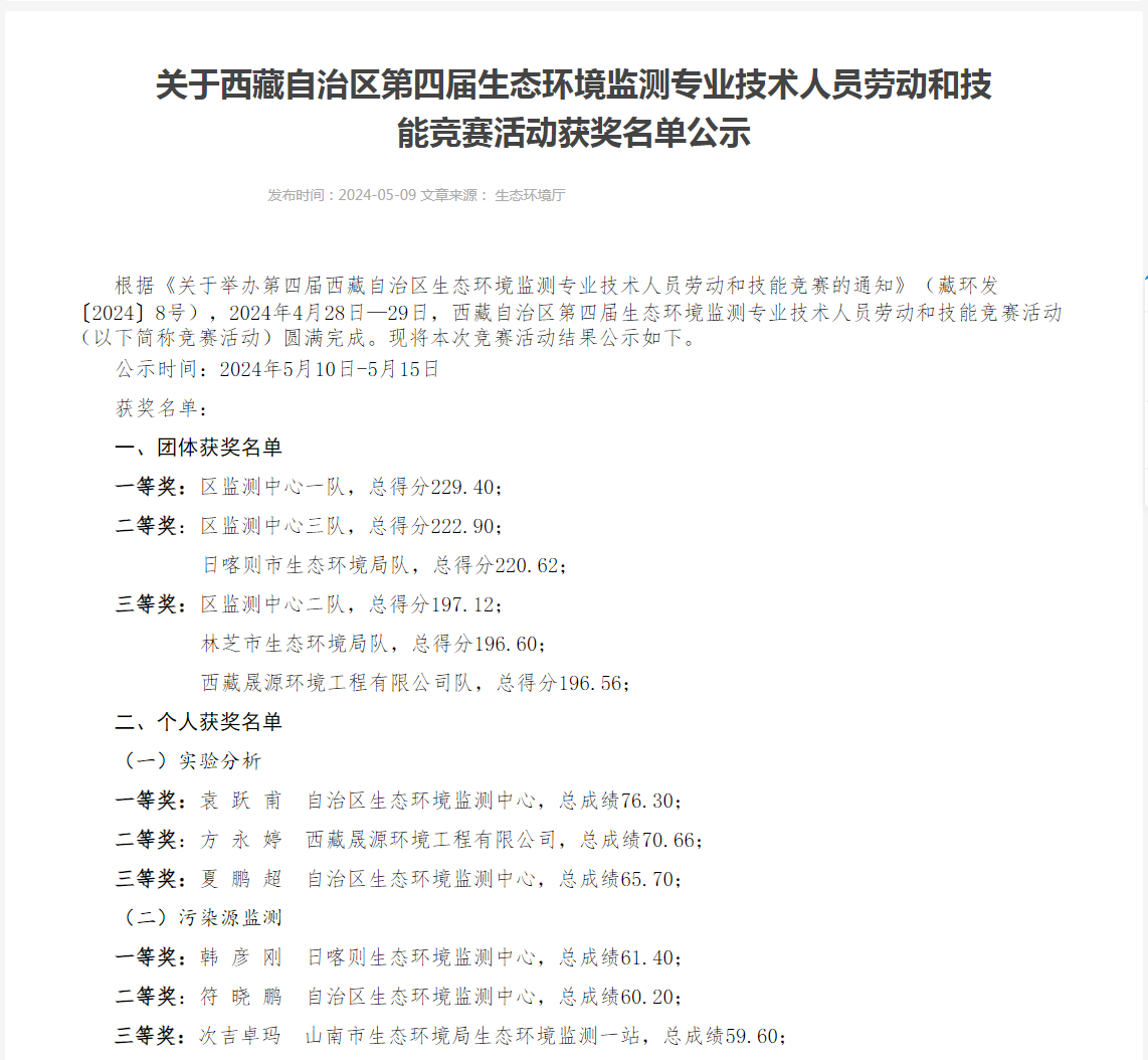 2024年59日,西藏自治區(qū)生態(tài)環(huán)境廳公布2024第四屆西藏自治區(qū)生態(tài)環(huán)境監(jiān)測(cè)專業(yè)技術(shù)人員勞動(dòng)和技能競(jìng)賽(簡(jiǎn)稱“第四屆大比武”)獲獎(jiǎng)名單,四川省天晟源環(huán)保股份有限公司子公司西藏晟源環(huán)境工程有限公司以下簡(jiǎn)稱西藏晟源”)團(tuán)體獎(jiǎng)三等獎(jiǎng)在第三方社會(huì)監(jiān)測(cè)機(jī)構(gòu)中名列第一,同時(shí)方永婷斬獲實(shí)驗(yàn)分析組個(gè)人獎(jiǎng)項(xiàng)二等獎(jiǎng)。繼第三屆大比武獲獎(jiǎng)后,西藏晟源在第四屆大比武中再創(chuàng)佳績(jī),展現(xiàn)了西藏晟源西藏自治區(qū)區(qū)內(nèi)環(huán)境監(jiān)測(cè)領(lǐng)域的過(guò)硬實(shí)力。