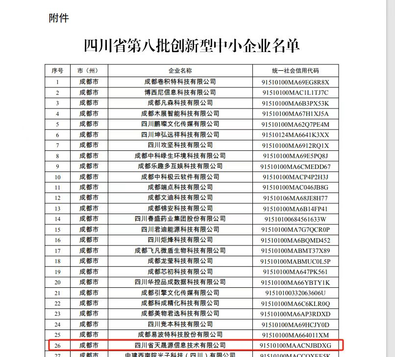 近日,經(jīng)四川省科學(xué)技術(shù)廳、四川省經(jīng)濟和信息化廳審核認證,天晟源環(huán)保全資子公司四川省天晟源信息技術(shù)有限公司(以下簡稱天晟源信息”)憑借扎實的核心業(yè)務(wù)、強勁的創(chuàng)新技術(shù)和研發(fā)能力成功榮獲四川省“科技型中小企業(yè)”創(chuàng)新型中小企業(yè)雙重認定。
